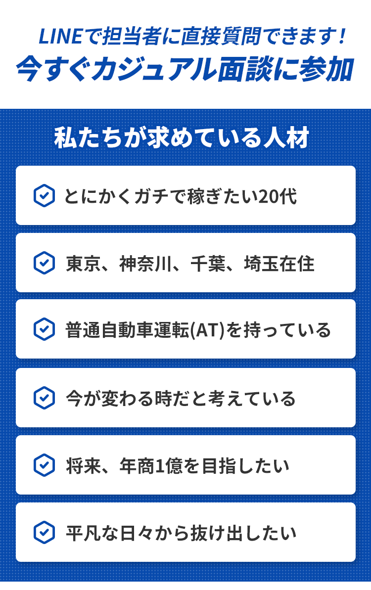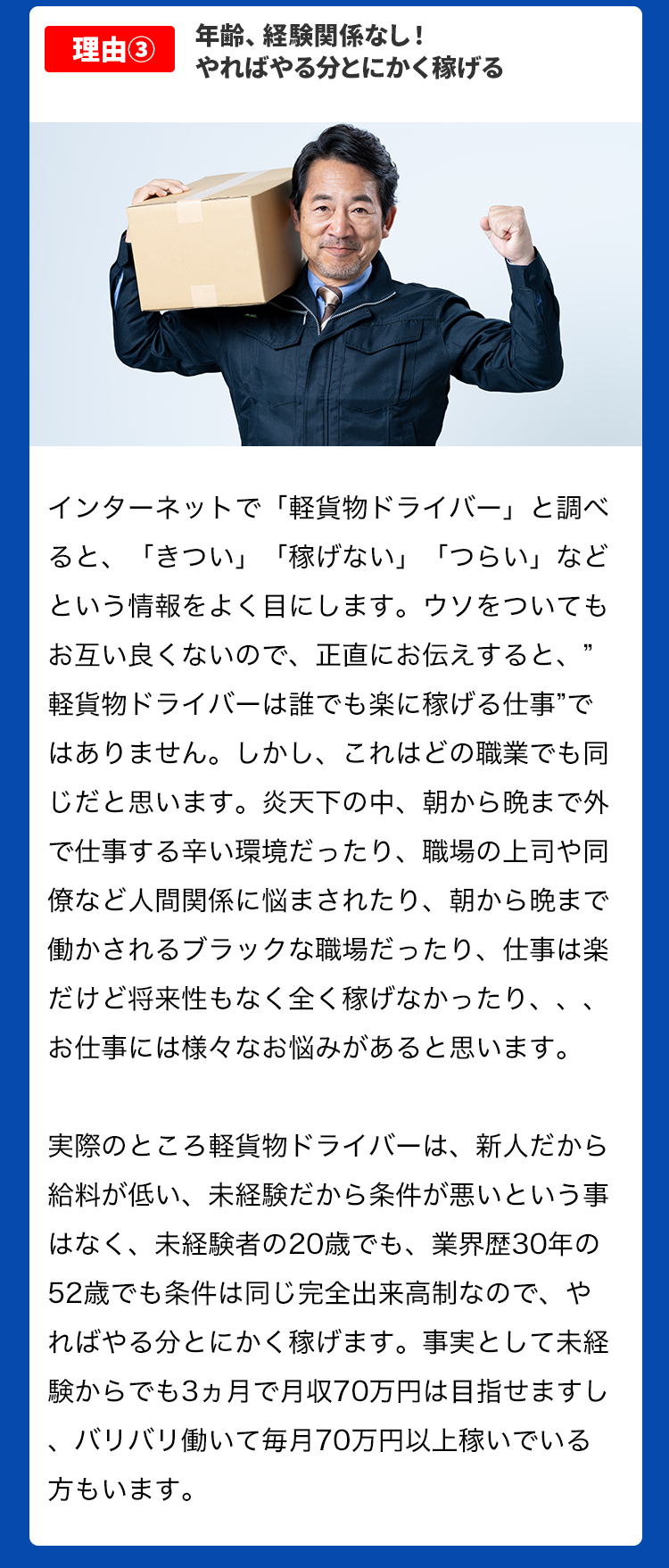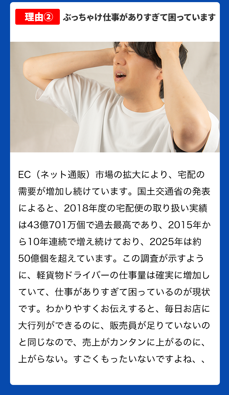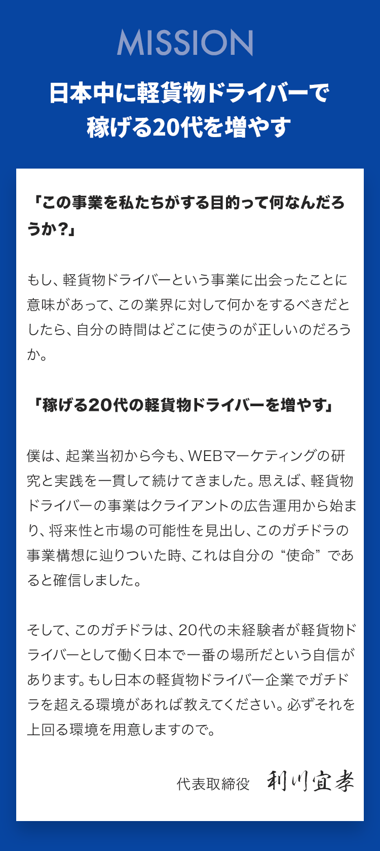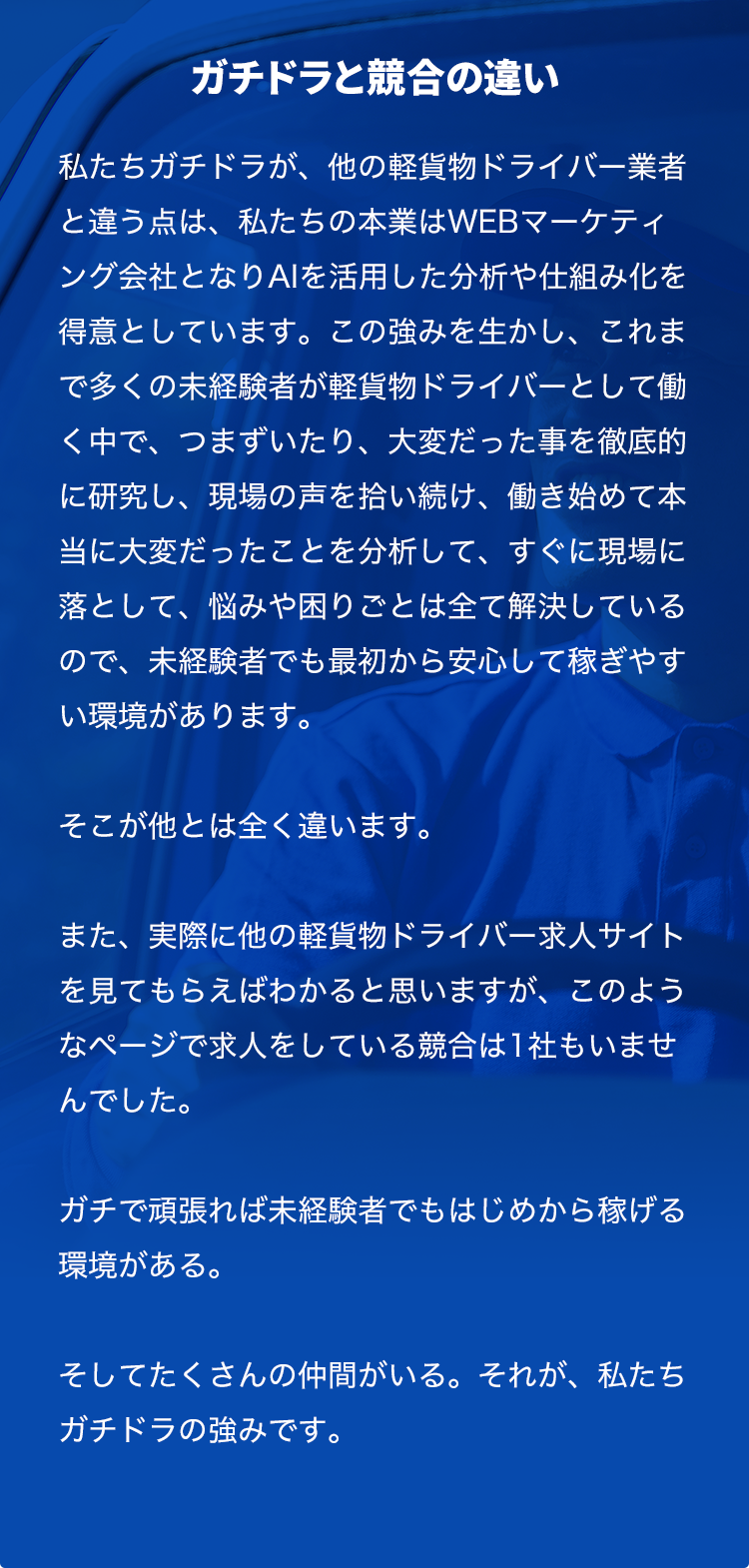 というのも、私たちが軽貨物ドライバー事業に携わる中で、世の中に「20代の未経験者がもっと稼げる最高の環境が無い」ということに気づきました。ネットで調べても、「日当2万円保証」「いつでも休める」「週休2日」「副業OK」といった、どこの会社も横並びで、同じような条件の求人が溢れています。本当はもっと高い報酬と環境を提供できるにも関わらず、残念ながら、今後もこの状況は変わらないと思います。