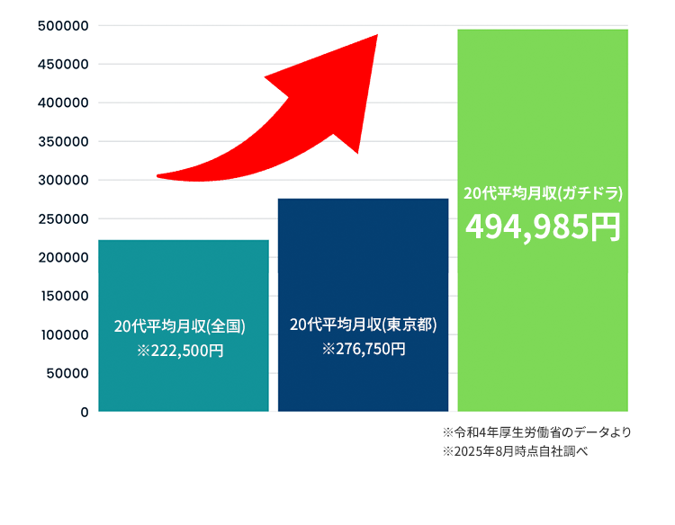 今、私たちと一緒に働く「稼ぐ20代」が、増えに増えまくっています。去年2024年は、この軽貨物ドライバー市場の大きな波に乗れたおかげで、私たちと一緒に働く20代の仲間達の平均年収を、厚生労働省が発表している東京都民20代男性の平均年収3,801,000円より56.2%高い5,939,820円まで引き上げることに成功しました。そして、この大きな波は2025年になっても、落ち着くどころか、ものすごい勢いで成長しています。