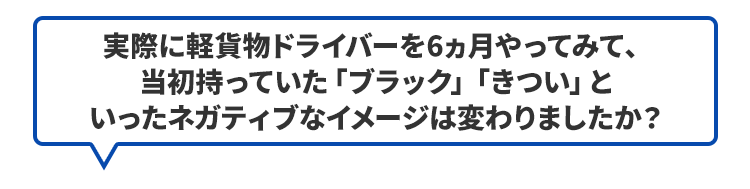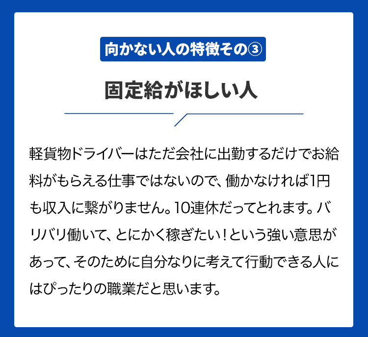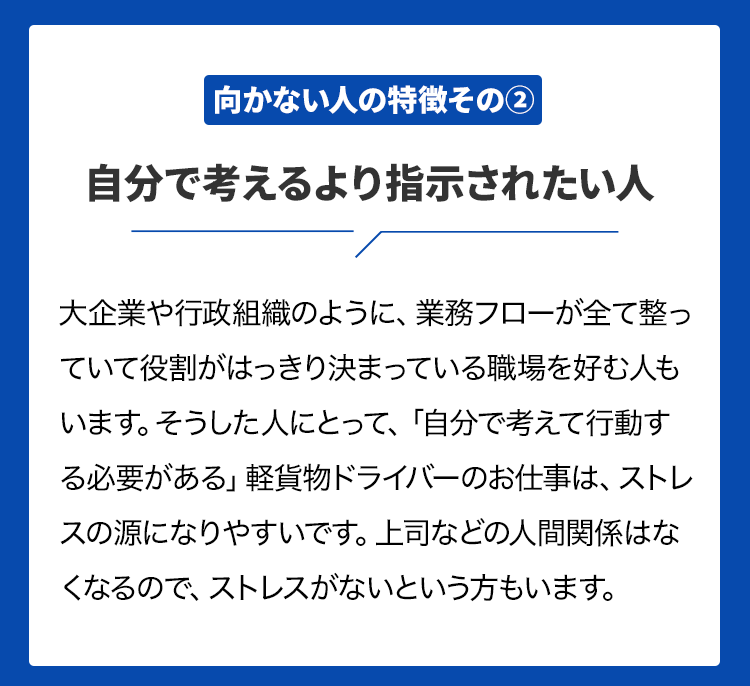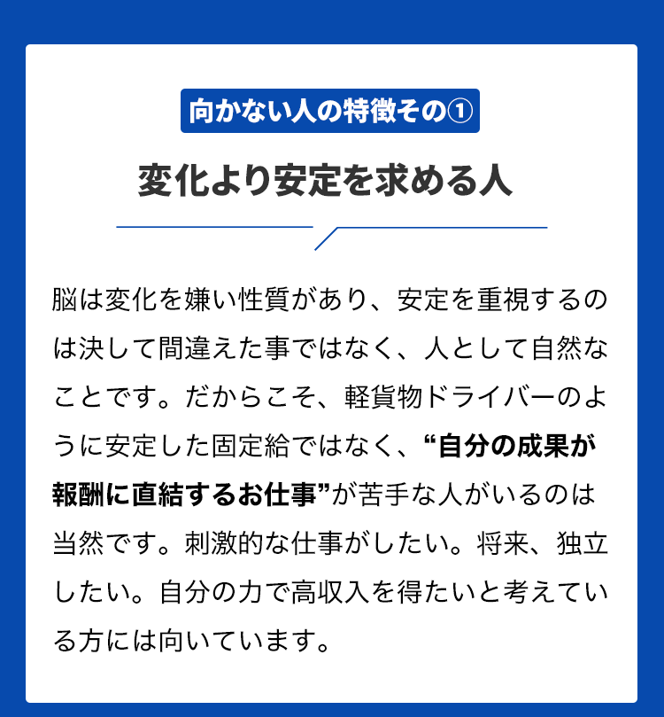 私たちがお伝えしたいのは、「軽貨物ドライバーに向かない人=私たちと縁がない」ではないということ。実際に軽貨物ドライバーに合わないと考えている人ほど、私たちが用意する環境で大きく力を発揮する可能性があったりもします。