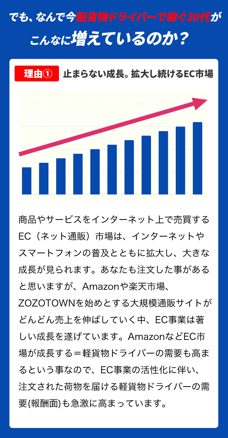 市場規模が成長するということは、お仕事が溢れているということ。結論、少しでも軽貨物ドライバーというお仕事に少しでも興味があるのなら、絶対に今すぐはじめるのが良い,,, こちらのグラフは、矢野経済研究所が調査した市場規模を予測したグラフですが、Amazonを中心にECサイトの需要が増加し続けていること、小口配送の荷物が急増しているなどの理由から、軽貨物ドライバー市場の成長スピードは落ちる事はなく急増しています。