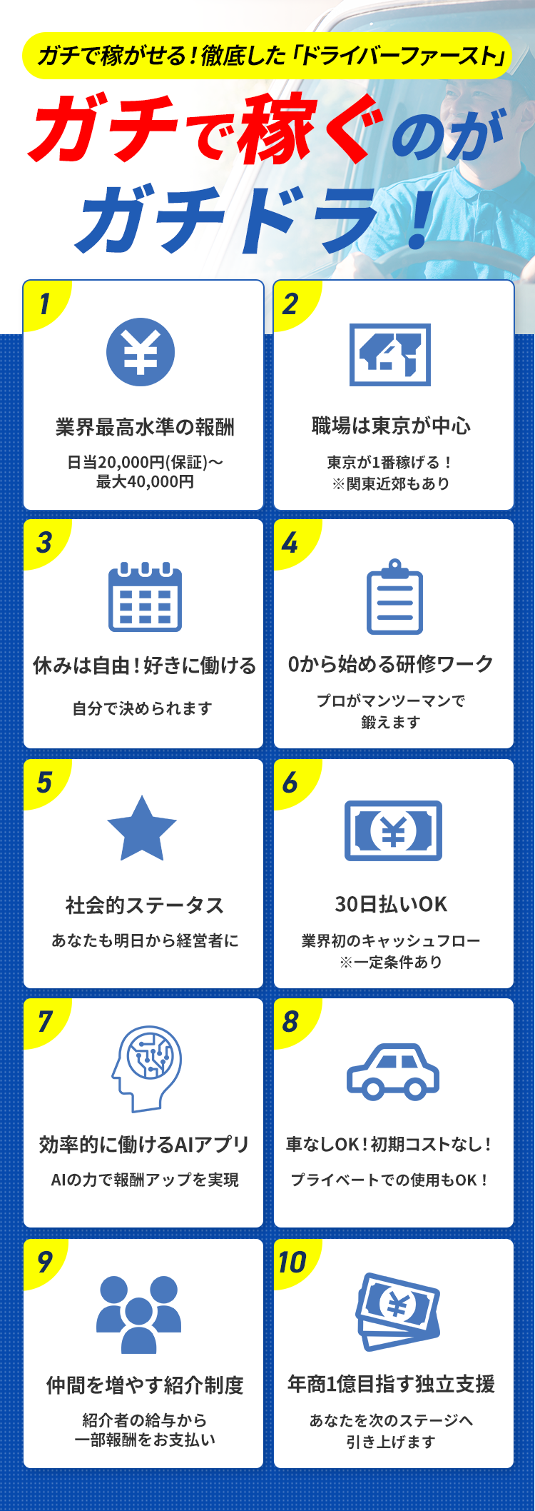 ガチドラは、ただ軽貨物ドライバーとして働くだけではなく、その先である、年商1億円を目指す経営者となる独立支援も行っています。あなたが軽貨物ドライバーとしてだけでなく、経営者として成長できる環境がここにあります。