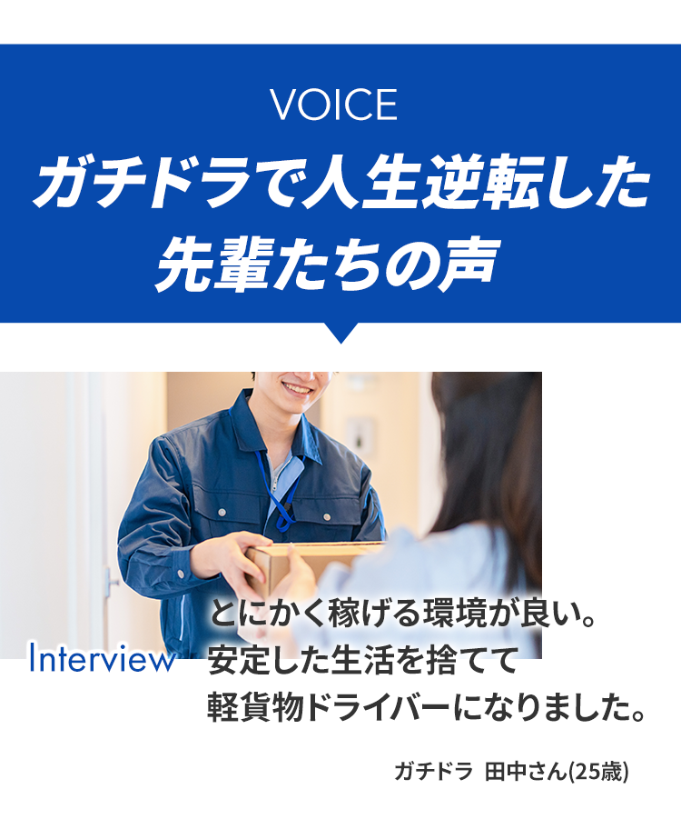 私は幼少期から安定志向だったのですが、上司の姿を見て将来このままで平気なのか?このままいたらリスクだなと考えるようになり、公務員という安定した生活を捨てる事を決意し、いろいろ仕事を探していたなかで見つけたのが軽貨物ドライバーでした。もともと大学時代の知人がそういった業種で働いていたので、最初は知人から情報を聞いたりしていましたが、最終的にはインターネットで調べてガチドラを見つけました。