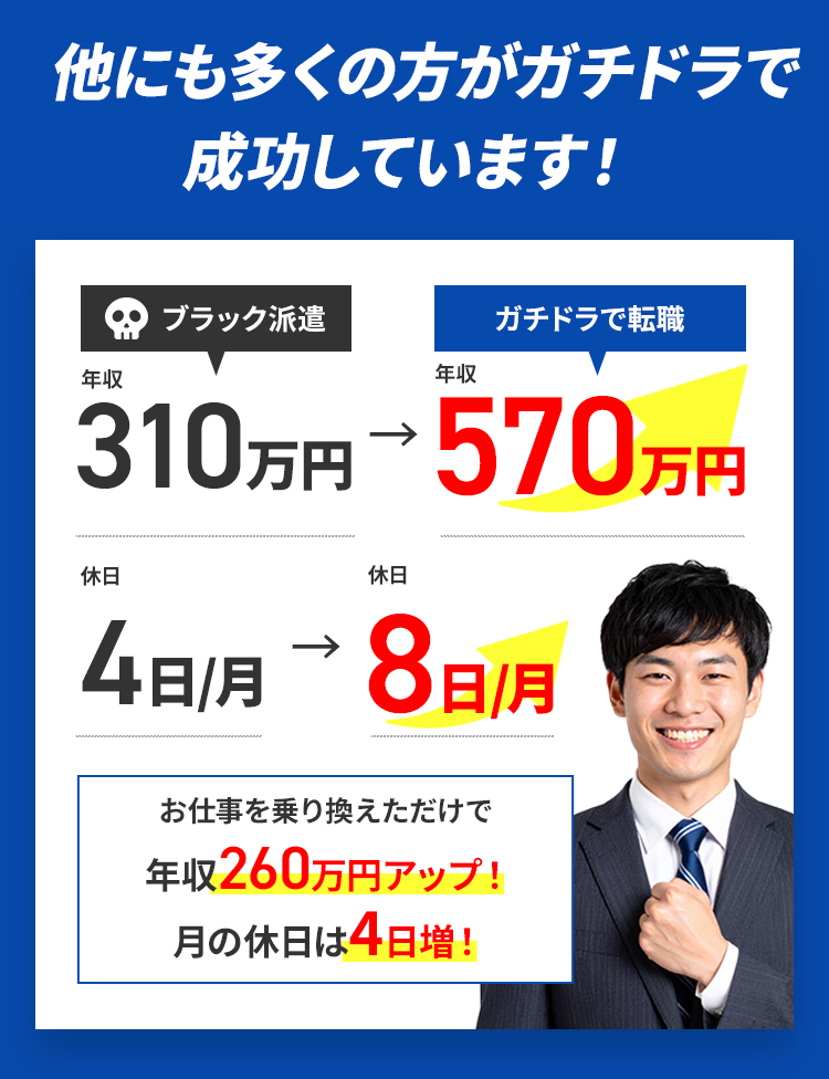 今は仕事がめちゃくちゃ楽しい。夏休みに夢中でやっていたゲームのように、やればやる分、収入に直結するのが最高です。(毎月、口座残高を見てニヤニヤしてる時間が幸せ)最初はたしかにハードですが、そんなハードな環境に身を置きたい成長意欲の高いあなたは、ガチドラさんで話を聞いてみて欲しい。